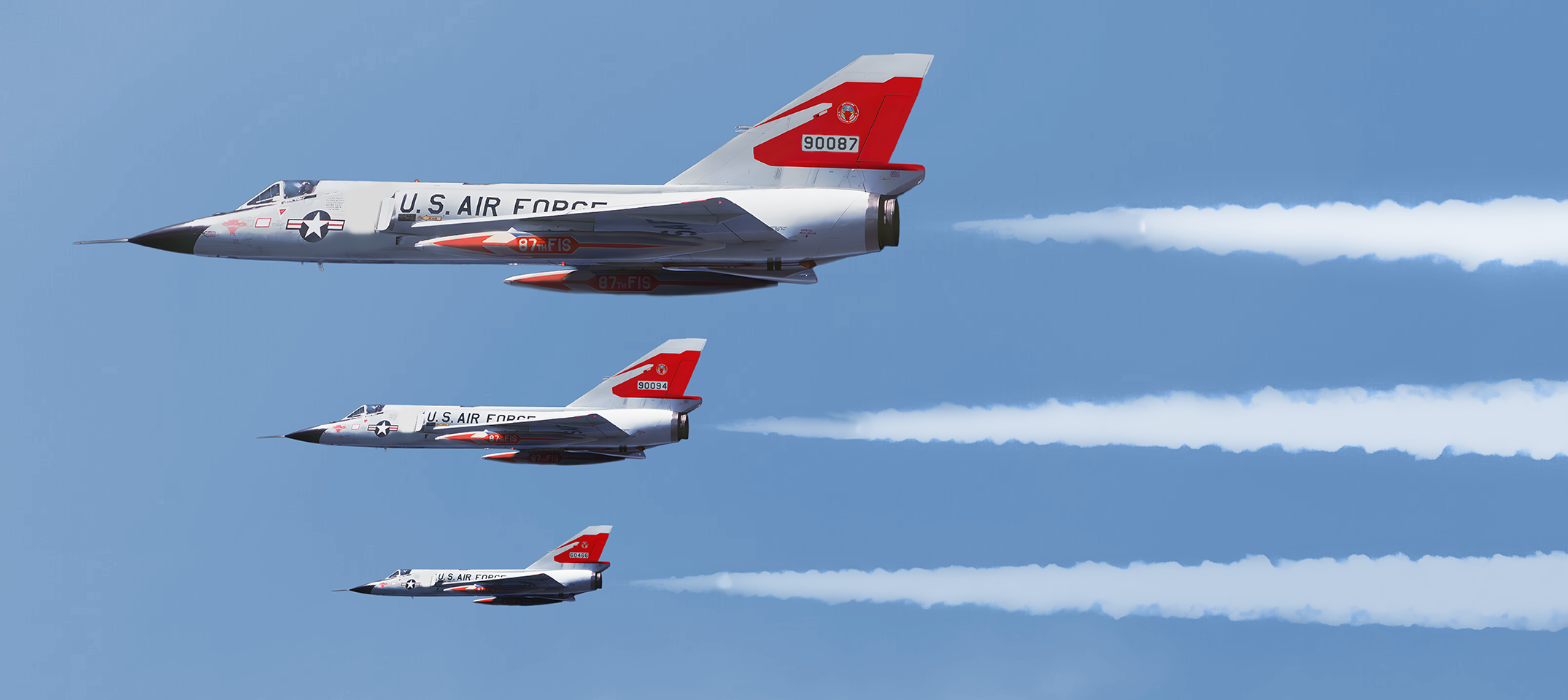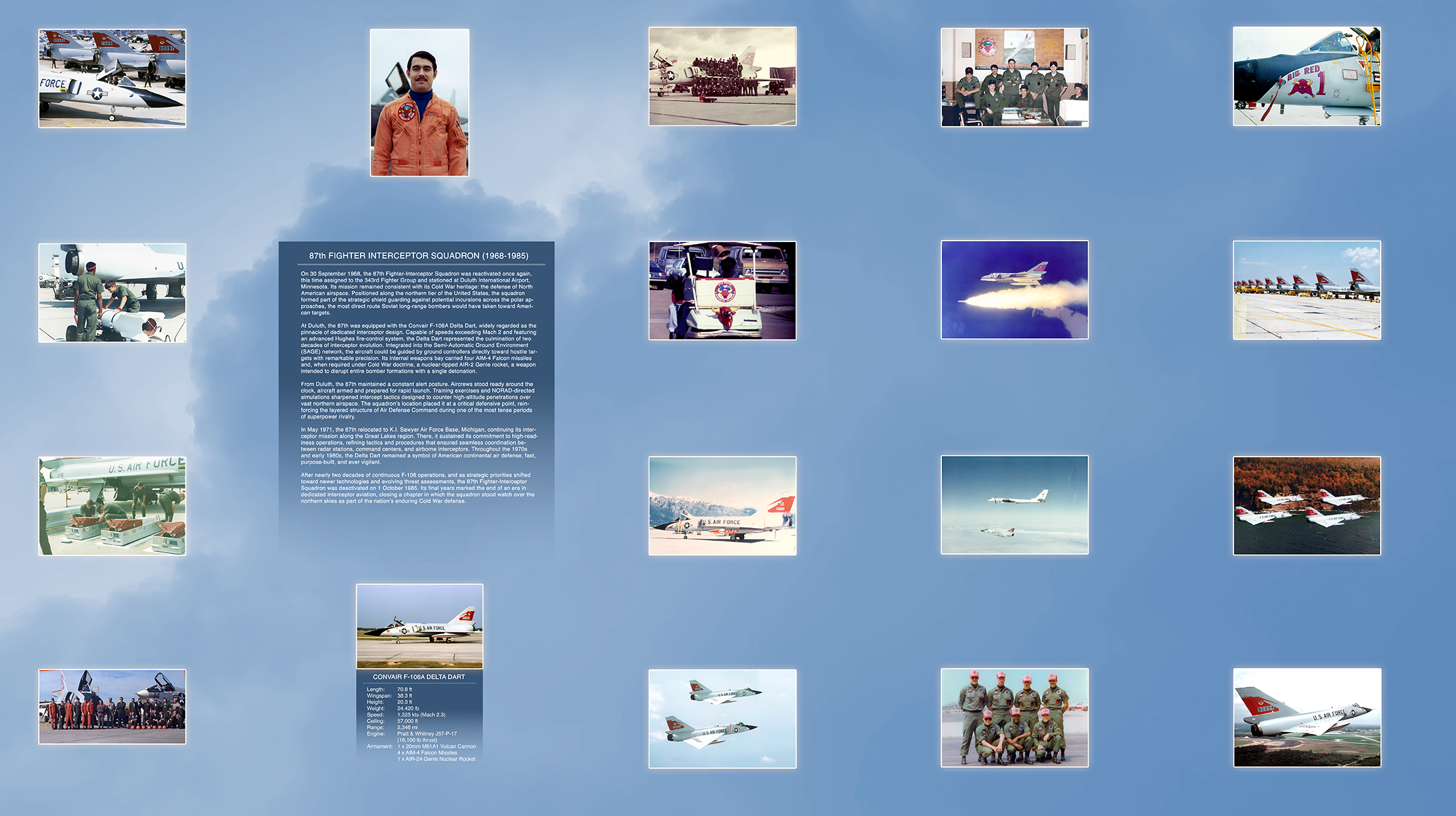 At Duluth, the 87th was equipped with the Convair F-106A Delta Dart, widely regarded as the pinnacle of dedicated interceptor design. Capable of speeds exceeding Mach 2 and featuring an advanced Hughes fire-control system, the Delta Dart represented the culmination of two decades of interceptor evolution. Integrated into the Semi-Automatic Ground Environment (SAGE) network, the aircraft could be guided by ground controllers directly toward hostile targets with remarkable precision. Its internal weapons bay carried four AIM-4 Falcon missiles and, when required under Cold War doctrine, a nuclear-tipped AIR-2 Genie rocket, a weapon intended to disrupt entire bomber formations with a single detonation.