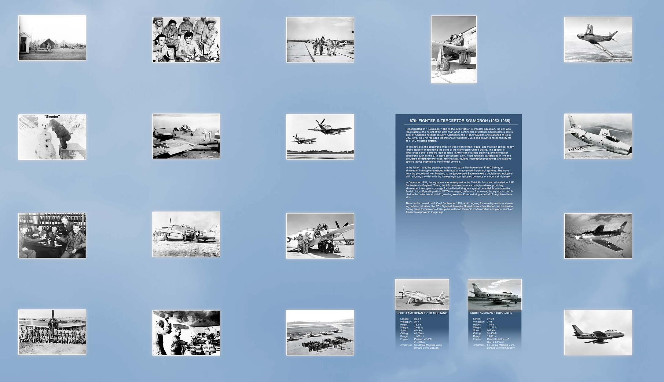 In the fall of 1953, the squadron transitioned to the North American F-86D Sabre, an all-weather interceptor equipped with radar and advanced fire-control systems. The move from the propeller-driven Mustang to the jet-powered Sabre marked a decisive technological shift, aligning the 87th with the increasingly sophisticated demands of modern air defense.