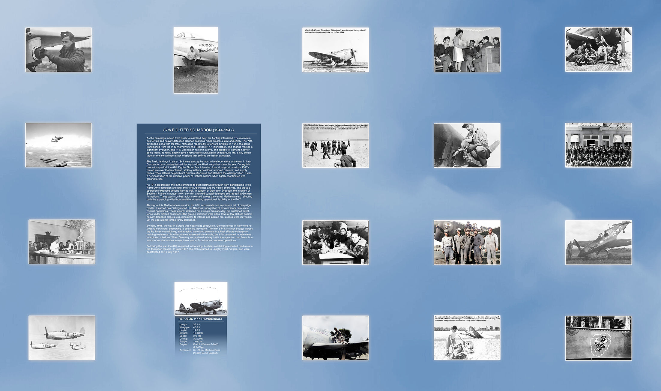 Following the war, the 87th remained in Horshing, Austria, maintaining a combat readiness in the European theater. In June 1947, the 87th returned to Langley Field, Virgina, and were deactivated on 15 July 1947.