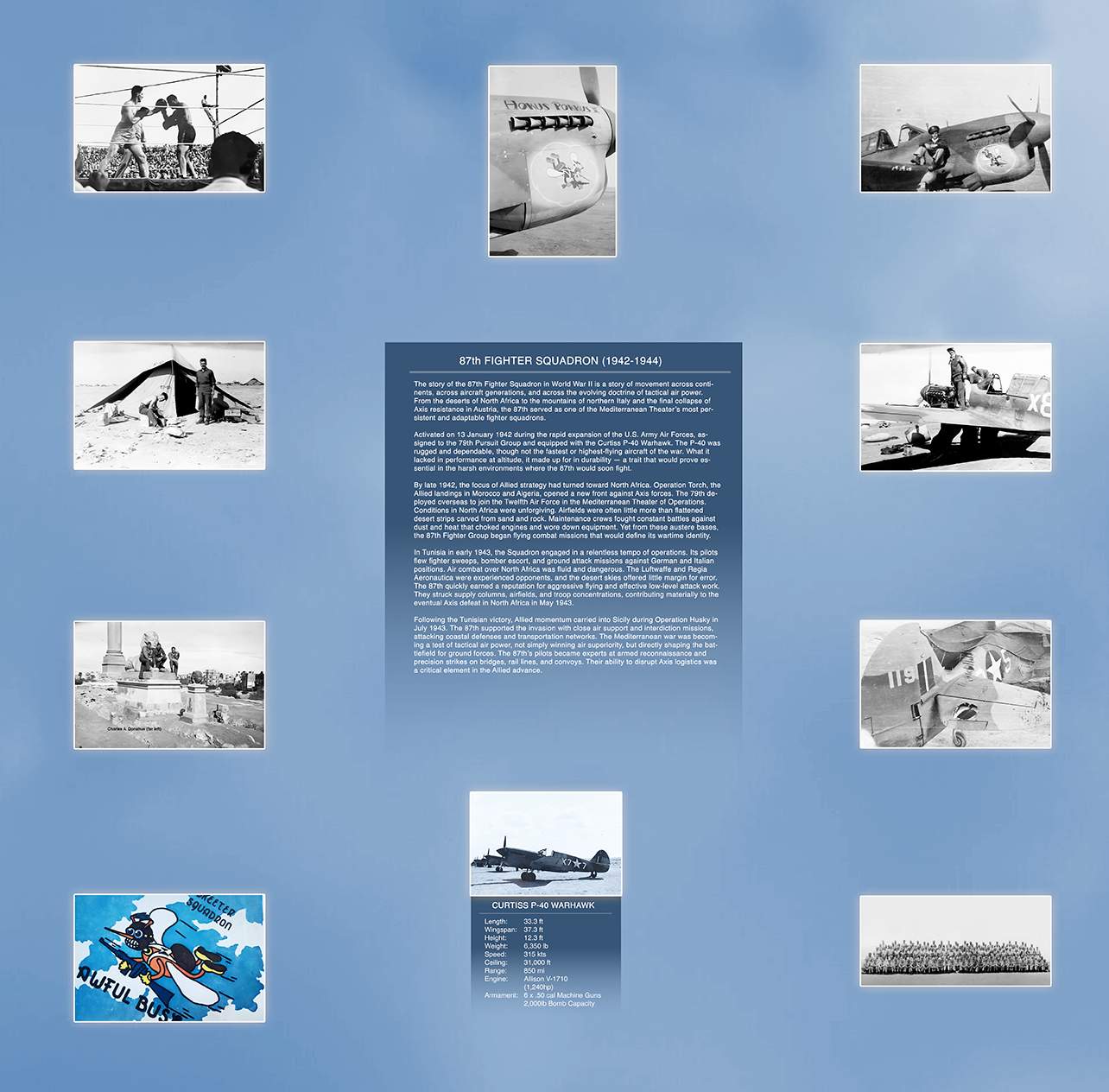 In Tunisia in early 1943, the Squadron engaged in a relentless tempo of operations. Its pilots flew fighter sweeps, bomber escort, and ground attack missions against German and Italian positions. Air combat over North Africa was fluid and dangerous. The Luftwaffe and Regia Aeronautica were experienced opponents, and the desert skies offered little margin for error. The 87th quickly earned a reputation for aggressive flying and effective low-level attack work. They struck supply columns, airfields, and troop concentrations, contributing materially to the eventual Axis defeat in North Africa in May 1943.